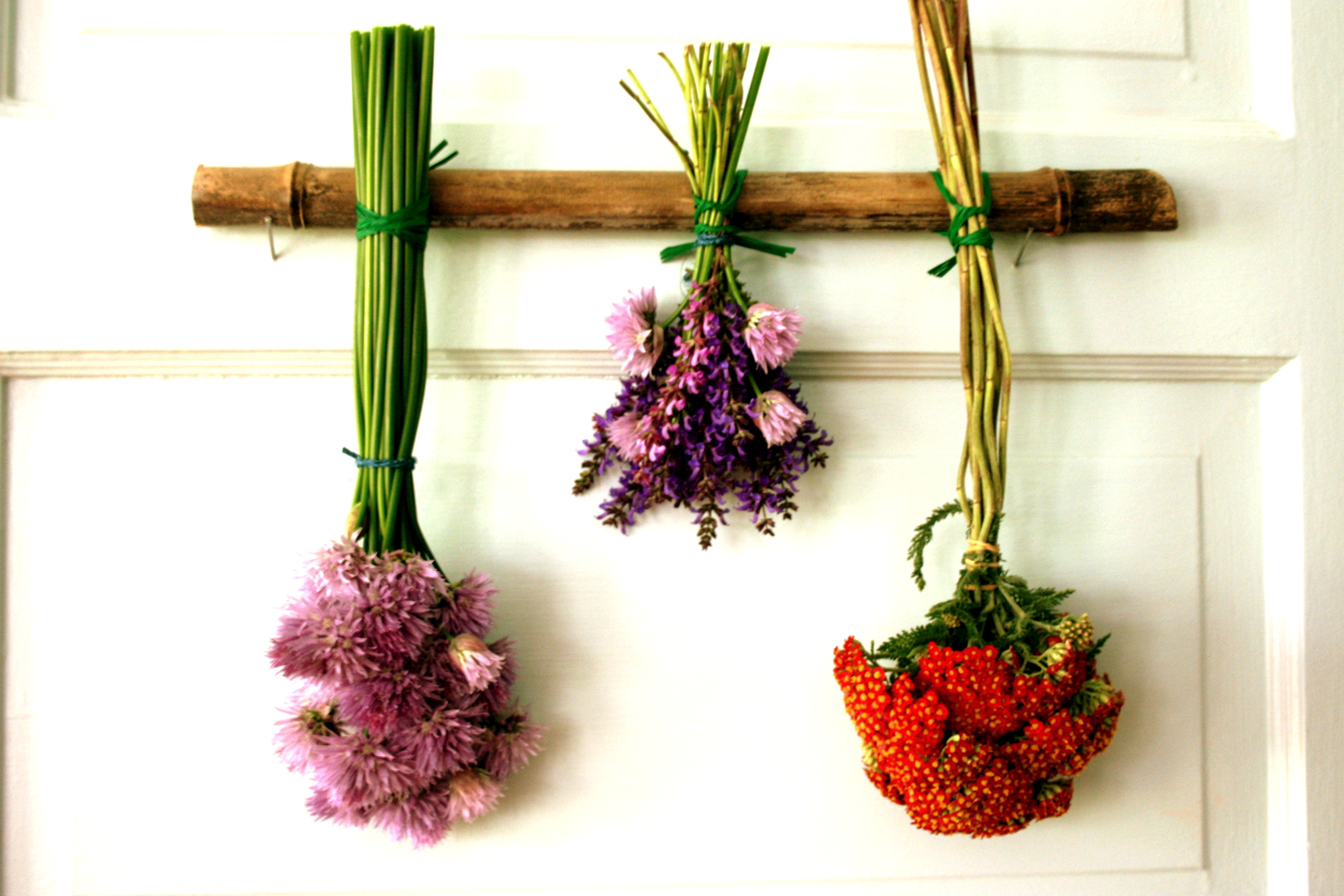 Feeling overwhelmed with all of the unfinished projects and day-to-day tasks like . . . weeding . . . this morning, I decided to spend the afternoon doing something a bit more creative.   After gathering handfuls of Chives, Salvia, and Yarrow, I cut a piece of bamboo and made a colorful drying arrangement for the kitchen. I felt completely refreshed by the time I finished- a little creativity always lifts my spirits!