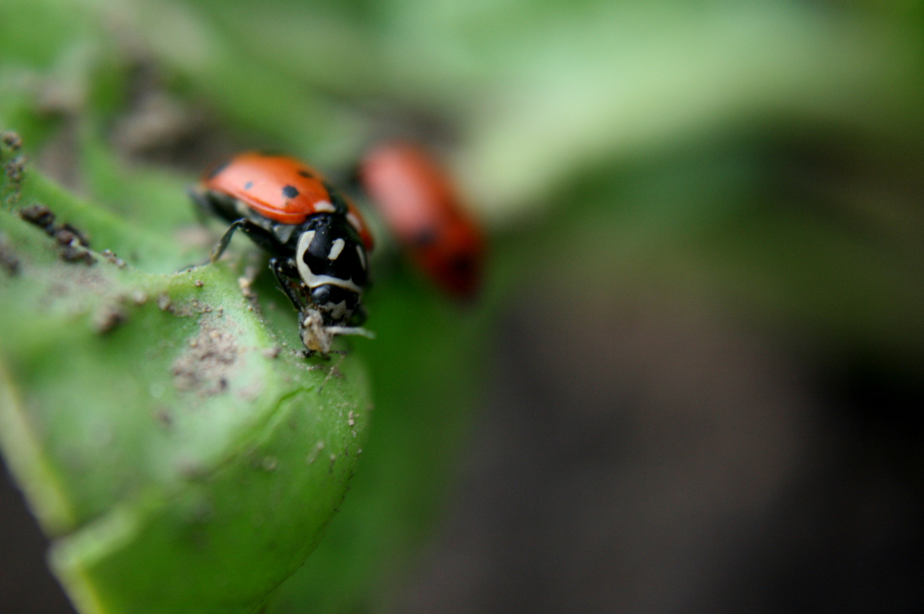 On a rainy evening last week, we released 1500 Laby Beetles into our hoop house. If all goes well, in a few days the Lady Beetles will start to leave clusters of eggs under leaves which will hatch into larvae shortly thereafter. Considering the fact that they’re finding food and that I’ve spotted a few already mating, I think there’s a good chance this will happen!
