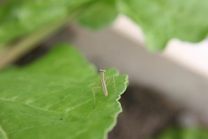 The egg cases we placed in the hoop house hatched a few weeks ago. Here’s a young mantis on the swiss chard.