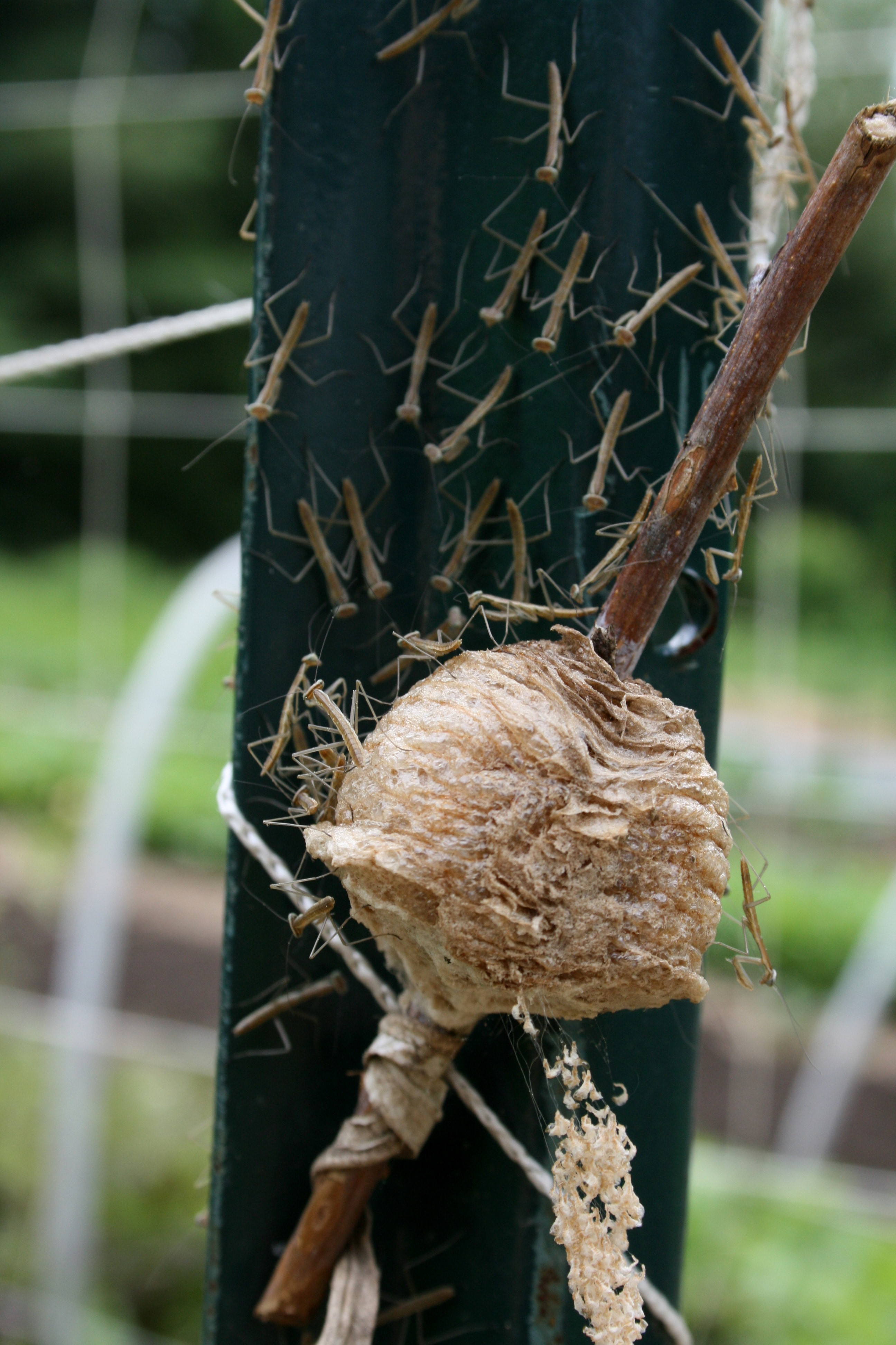 After our grasshopper trouble last year, we decided to bring some additional mantids for some extra support. Mantids will eat moths, crickets, grasshoppers, flies, and other insects. The praying mantis egg cases we placed in the garden early this spring are starting to hatch.