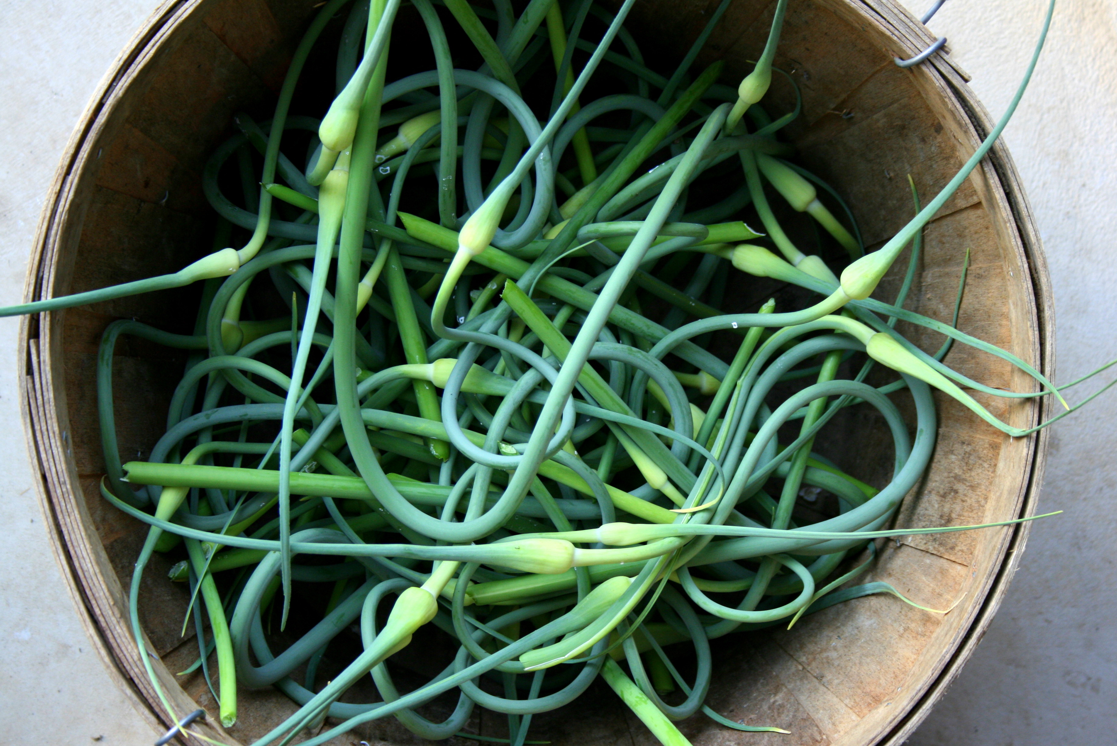 Garlic Scapes are the flower stalk of garlic and the entire stalk and “flower” are edible. For a mild garlic flavor add them to salads, stir-fry, sauces, pasta dishes, pesto & hummus. Check out 2 Sisters Garlic for more info on using scapes. And for another delicious recipe, check out the link Sara posted on our Facebook page for Garlic Scape & Swiss Chard Pesto!