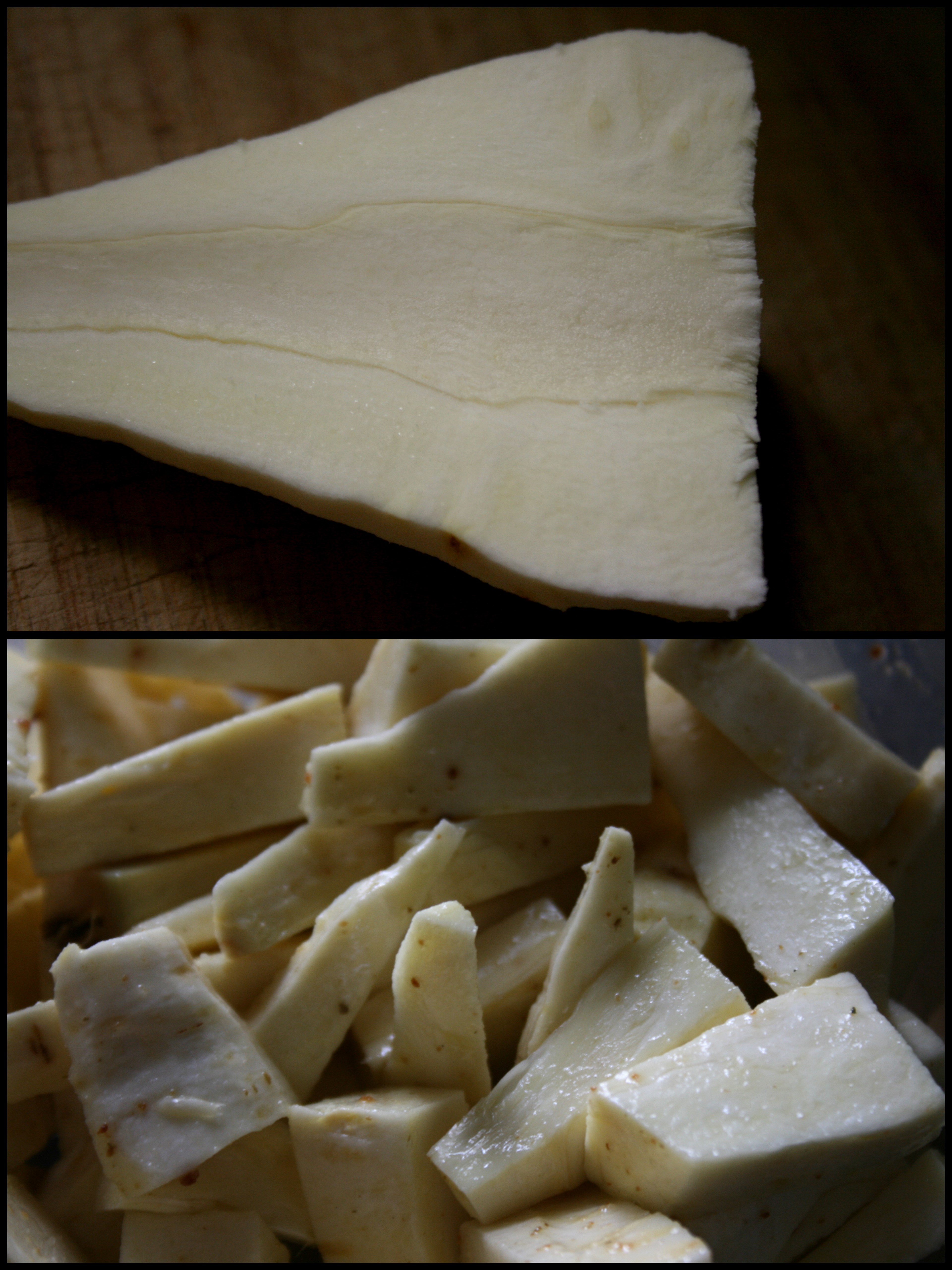 1. Peel parsnips and cut in half. You’ll notice a core running through their center (see top photo). Working around the core, cut the parsnip into 2 inch pieces.