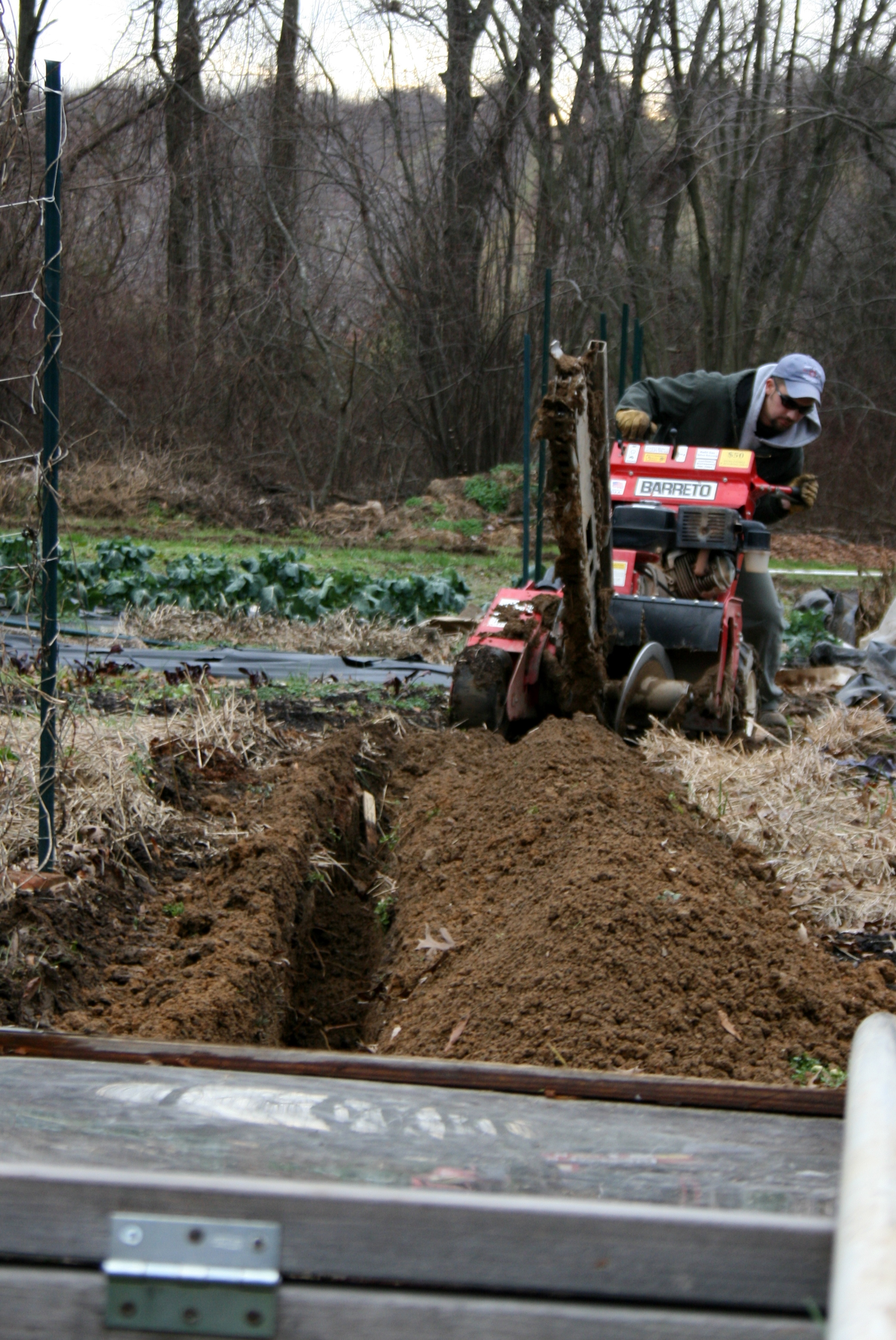 A freshly dug trench – the PVC irrigation line is almost in! These irrigation lines will distribute the overflow from our artesian well (which will be collected & stored in our newly constructed irrigation pond) to the drip tape that lines our crop rows during the growing season. Due to the excessive rains this season, it has been too wet to install the irrigation lines. There are still a few sections we’ll have to hand dig. But in the meantime, the trench digger that Zach’s operating (see below) is a big help! This project is underway thanks to the Rainbird Intelligent Use of Water Award that we received in March of 2011. Many thanks to all of you who diligently voted for us over the 2011 winter months! Our goal is to complete the irrigation project by March of 2012.
