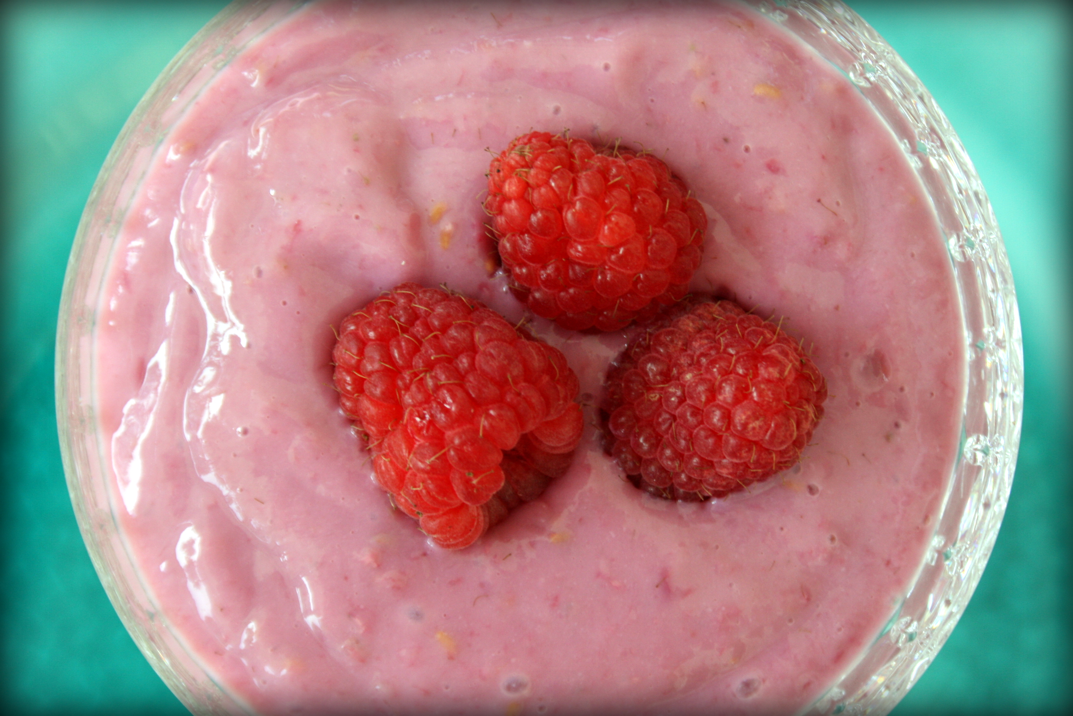 Combine ingredients in a blender & blend till smooth. Top with a few raspberries & enjoy!