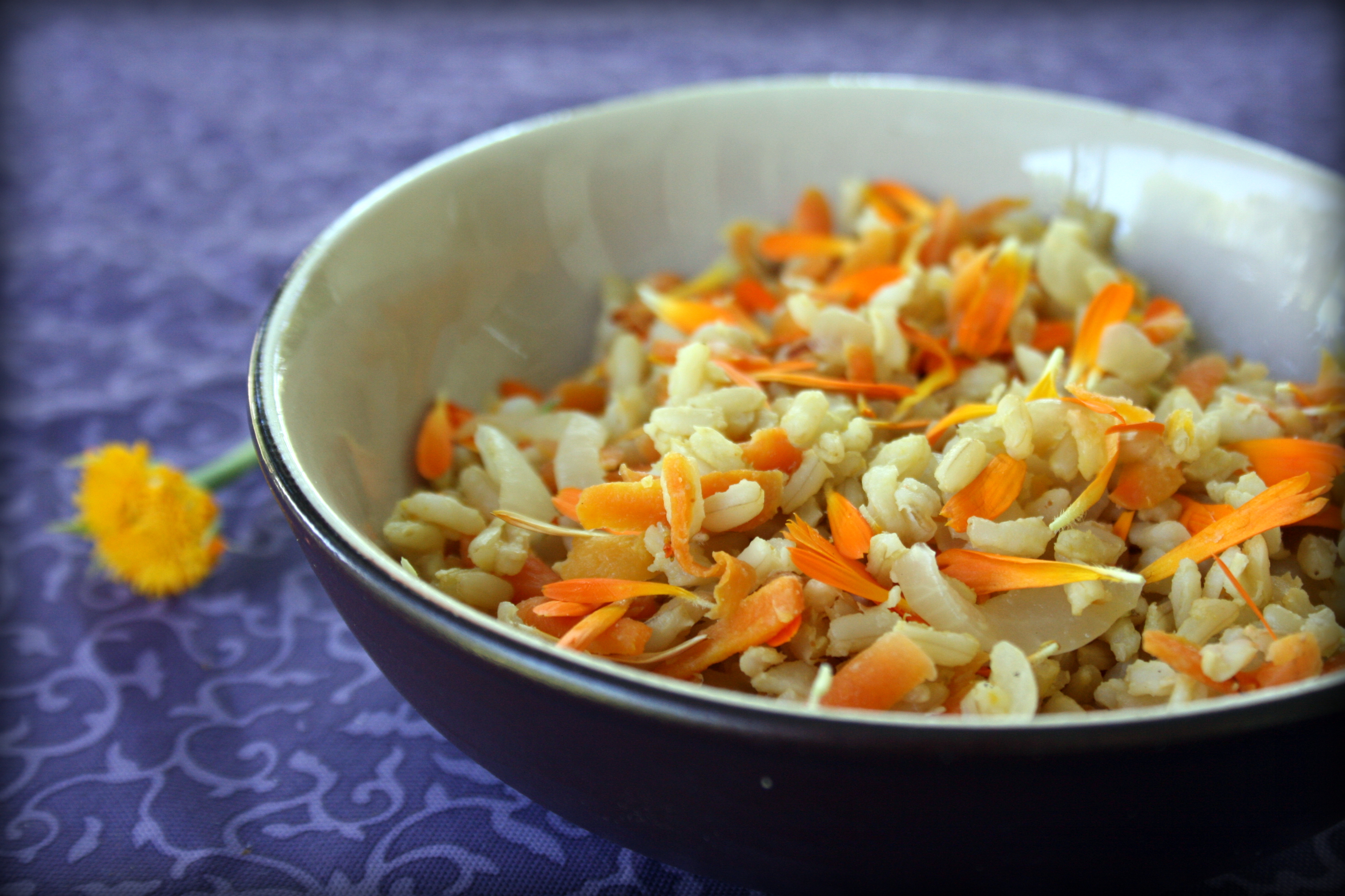 One of the recipes we learned during the second class of our Seasonal Cooking Adventure was a tasty Carrot Rice with Calendula Blossoms. The dish went perfectly with our main dish – grilled pork chops with lavender flowers & the fresh salad with roasted beets & honey-dill vinaigrette. Here’s the recipe for Carrot Rice with Calendula Flowers –
