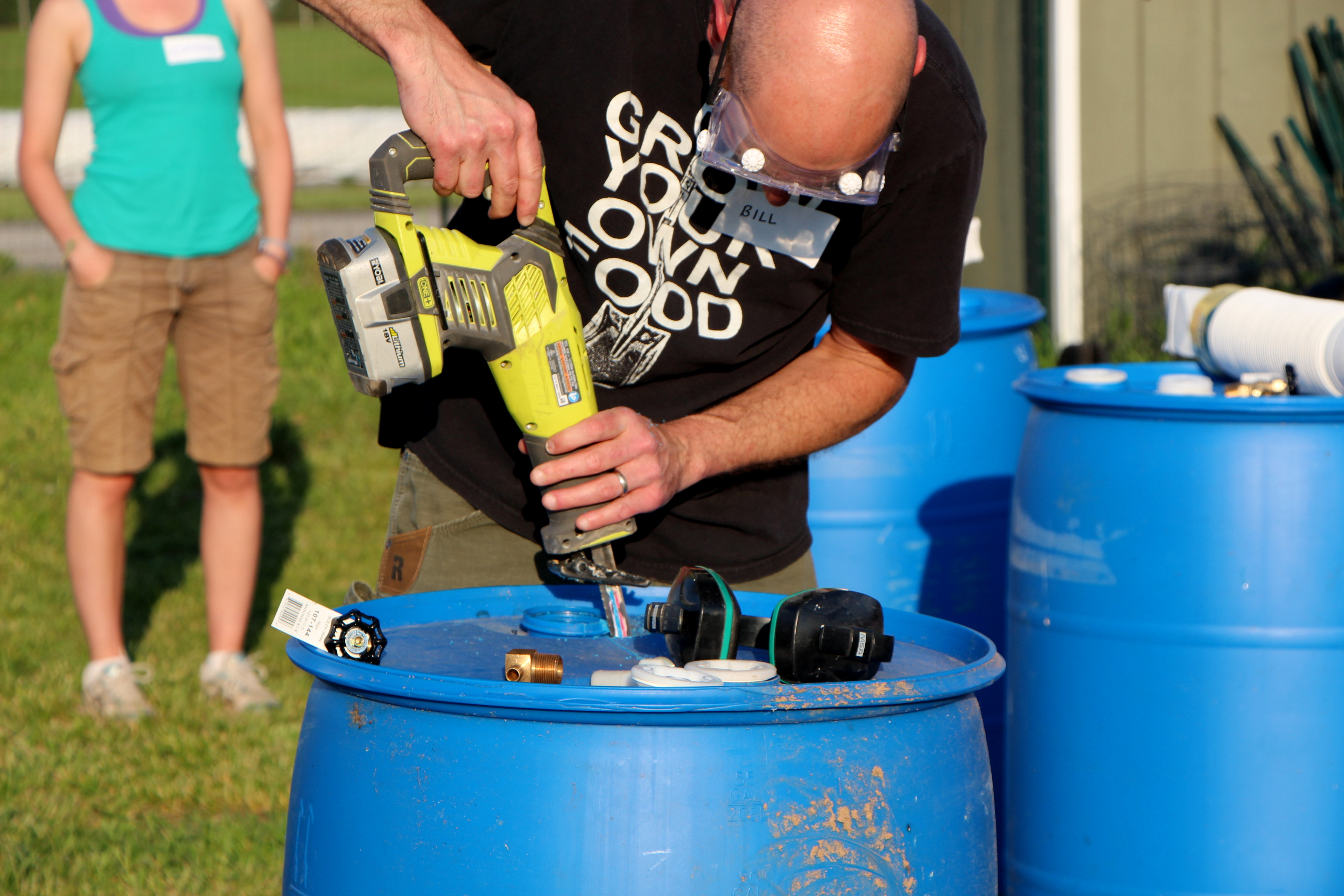 2. Wearing safety glasses, cut the hole on top of the barrel with a snips or some type of saw – a few options would be the reciprocating saw (what Bill