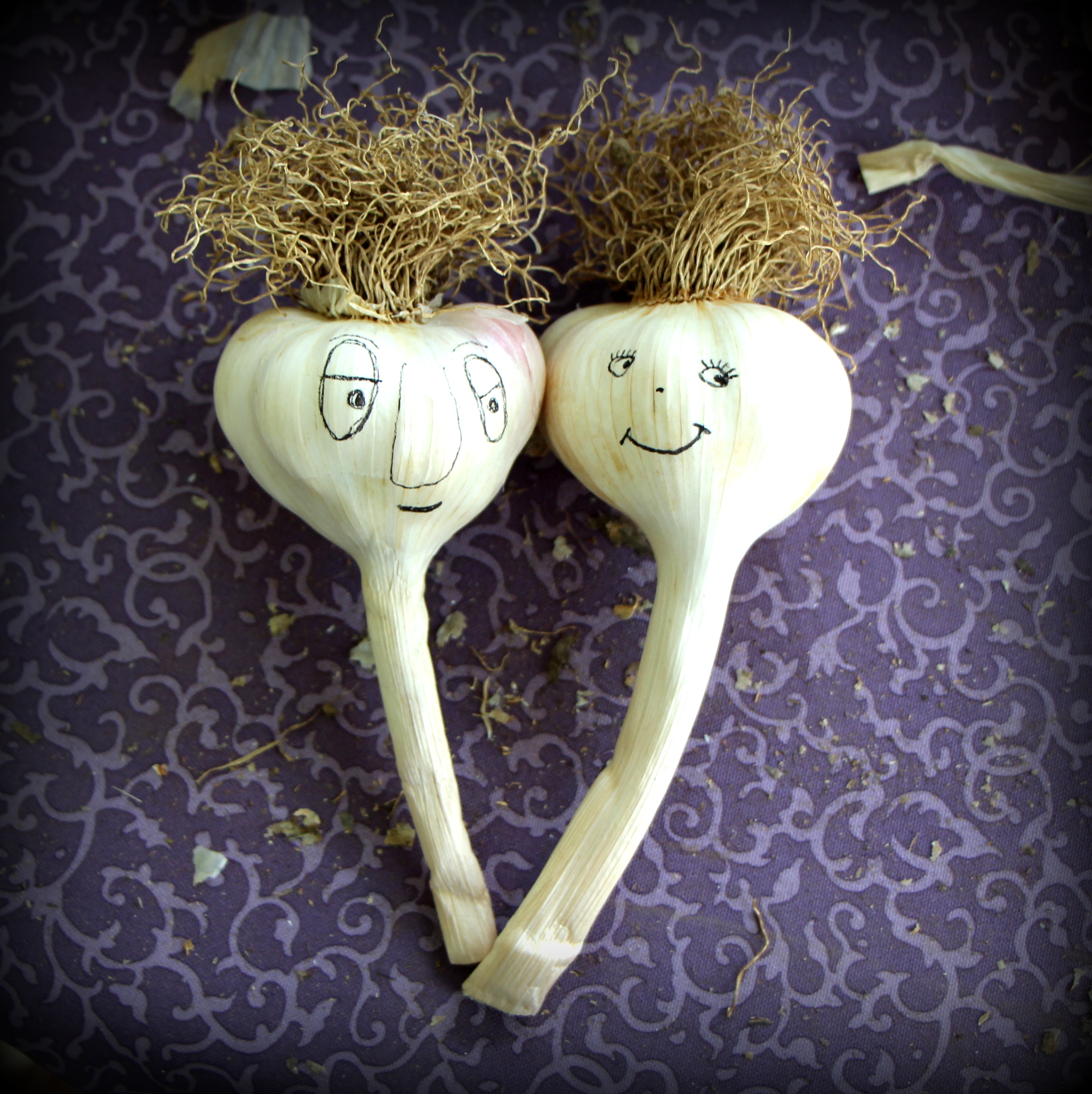 While cleaning and braiding garlic yesterday, we couldn’t resist having a little fun. I never knew garlic could have so much character 🙂